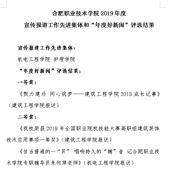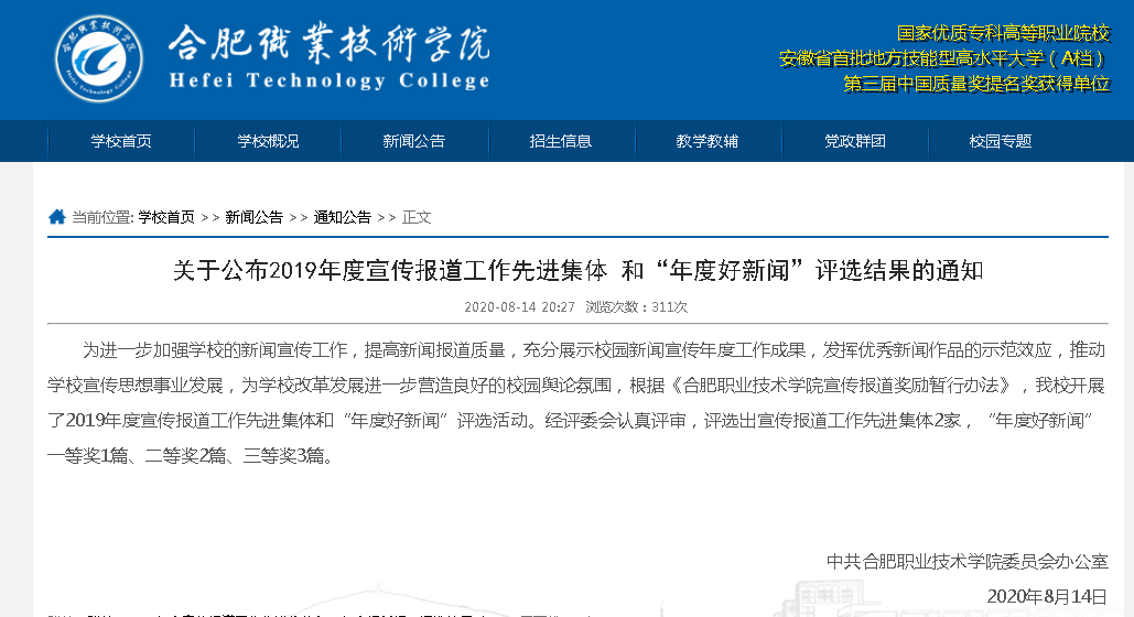 一年来,在公司党委的正确领导下,在全院教职工的大力配合下,公司深入挖掘教学、科研、人才培养工作成就和特色,积极开展新闻宣传工作,服务公司改革和公司发展大局,及时向校内外媒体报送了大量反映本单位工作特色和亮点的优秀稿件,2019年共发表新闻稿件91篇,其中外发安徽省教育网17篇。公司不断完善网站与新媒体建设,有效提升了影响力,助推了公司的内涵建设与发展。经公司党委宣传部评审,公司获评2019年度sunbet申搏官网宣传报道工作先进集体,新闻稿《甘当普通的一“员” 唱响持久的“辅”音 记sunbet申搏官网专职辅导员朱何萍老师》获评“年度好新闻”二等奖。