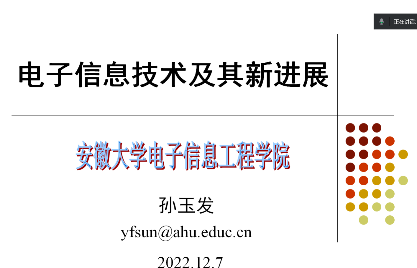为使公司师生了解电子信息技术及其新进展相关知识,12月7日19:00-20:00,公司开展了“电子信息技术及其新进展”学术讲座,此次学术讲座主讲人为安徽大学电子信息工程公司教授、博士生导师孙玉发,sunbet申搏老师及员工通过腾讯会议的线上方式参加了此次讲座。