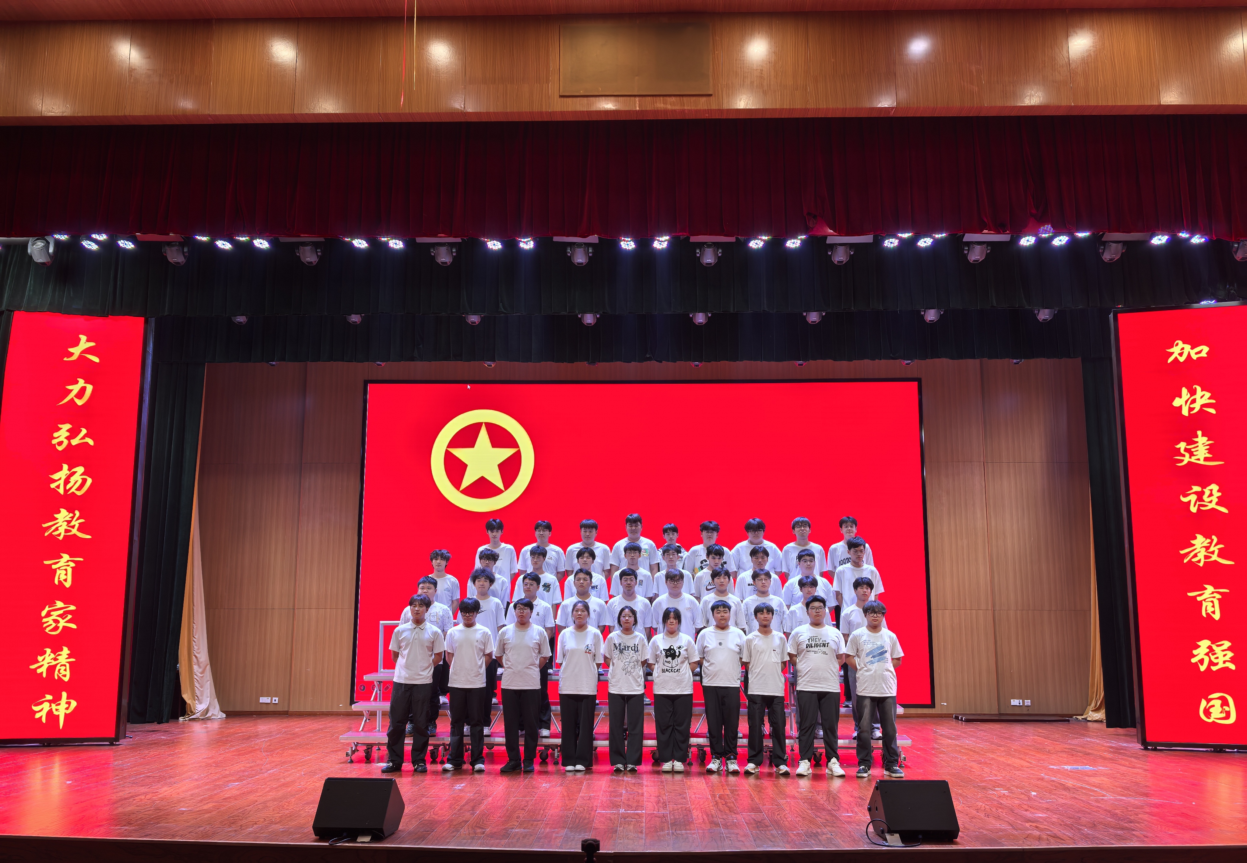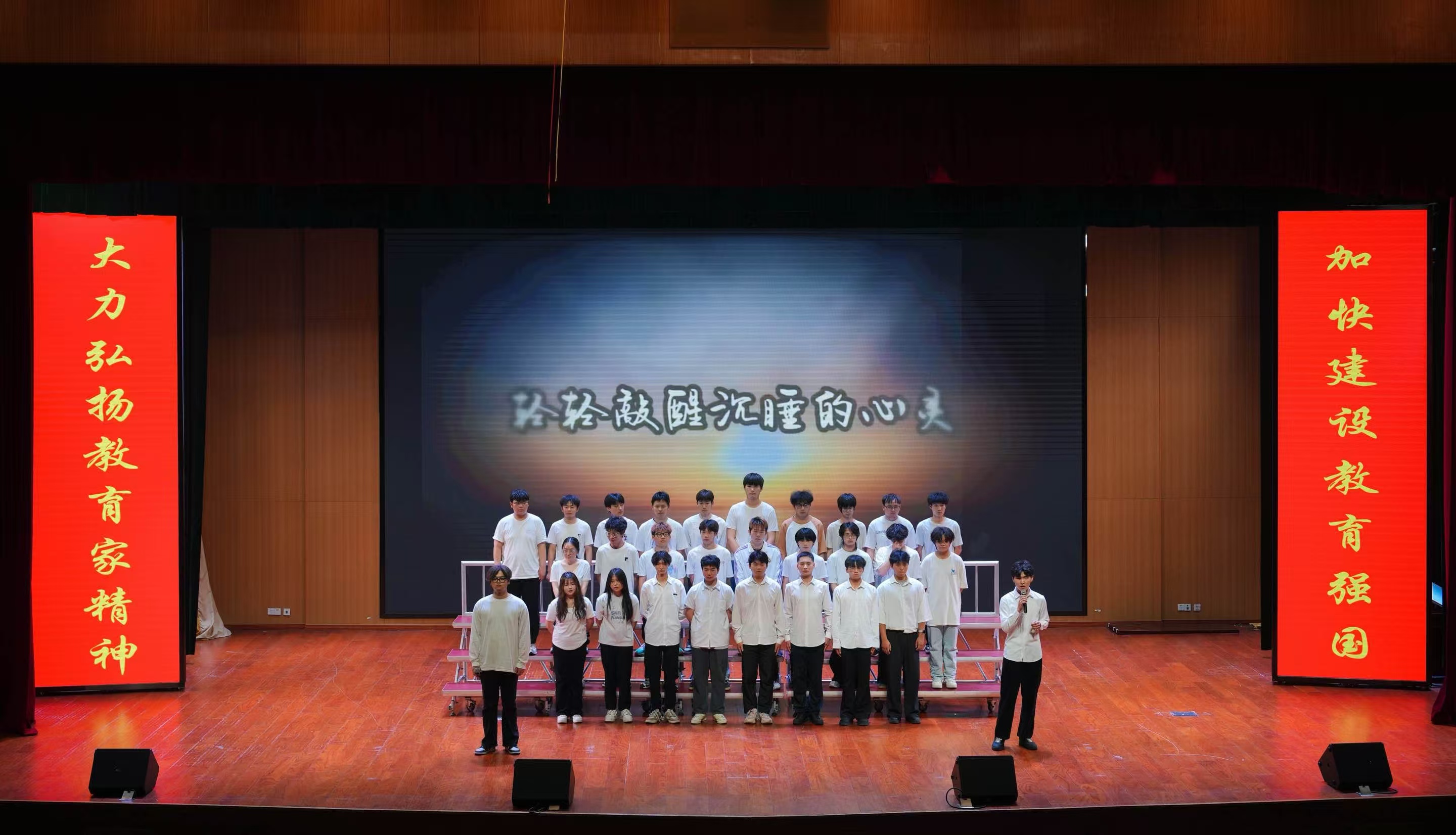此次合唱比赛分为固定曲目和选唱曲目两个环节。固定曲目为共青团团歌《光荣啊!中国共青团》,选唱曲目各个队伍紧紧围绕弘扬“五四爱国精神”这一主题进行演唱。歌曲中既有24机电3班《强军战歌》的雄浑豪迈,唱响“强国有我”的铮铮誓言;也有24智控1班《万疆》的婉转悠扬,绘就山河无恙的壮美画卷;24储能班《紫荆花盛开》以深情旋律诉说家国同心,24机电2班《无名的人》用温暖声线致敬平凡奋斗者的坚守。此外,24机械1班《相信自己》的昂扬斗志与24机械3班《我和我的祖国》的炽热告白,将比赛氛围推向顶峰。各班别出心裁的队形编排、整齐划一的服装设计,辅以朗诵、舞蹈等创意元素,为观众呈现了一场震撼心灵的视听盛宴。