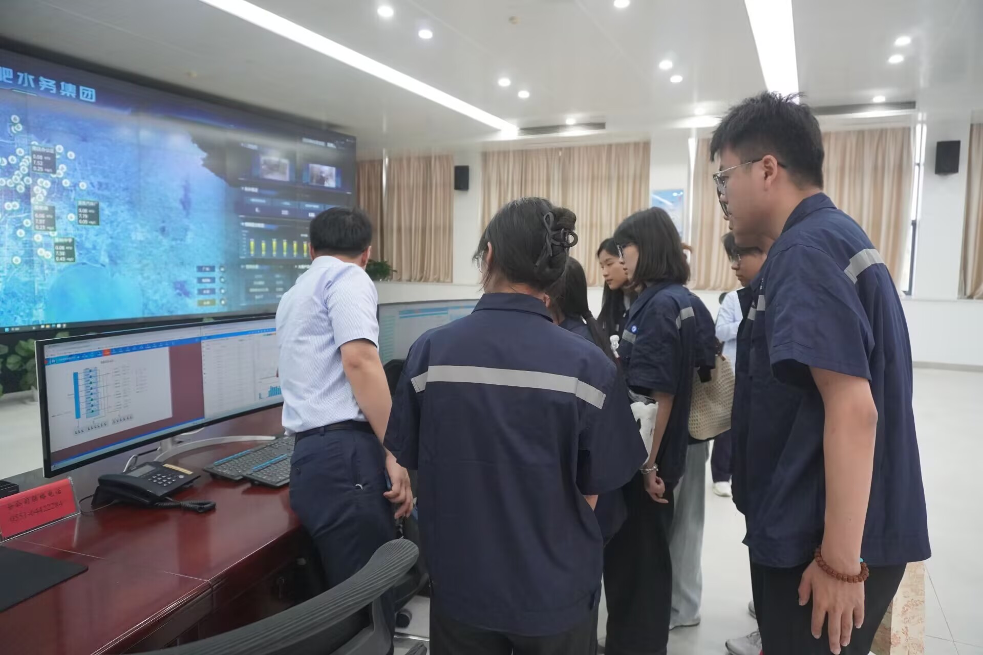 在参观调研环节,张杨同志带领师生参观水务集团调度中心和“连心桥”热线服务中心,系统了解从水源检测到终端服务的全链条供水保障体系。讲解员详细介绍了水务集团在水质监测、设备维护、应急抢修等方面加强服务保障的系列便民举措,表达了全力守护城市供水“生命线”的责任感和使命感。