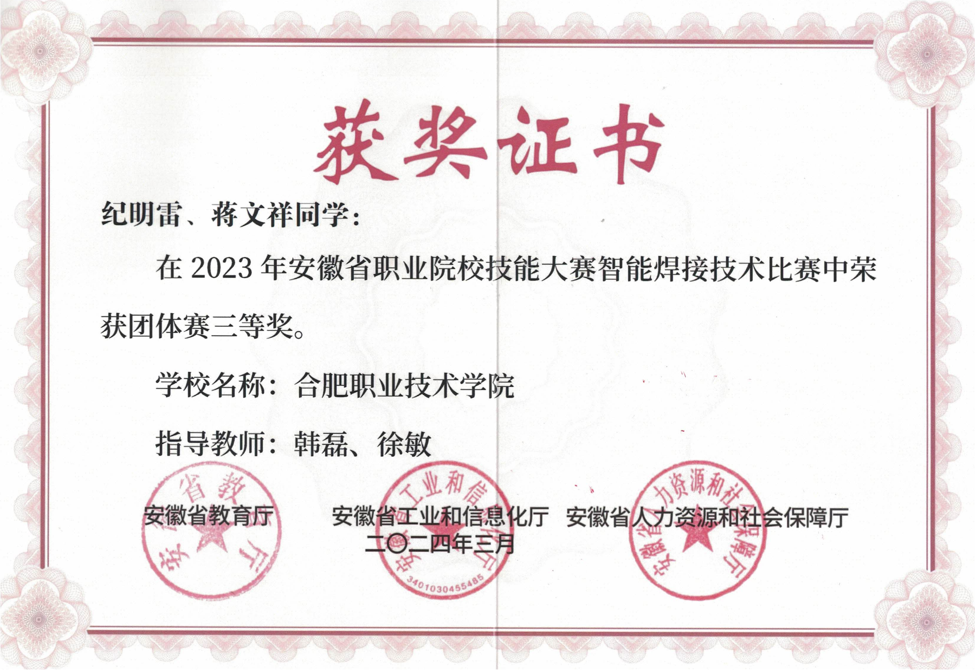 【专业建设成果】最近三年,智能焊接专业获得省级教学成果奖2项,申请省级教科研项目2项。专业员工在安徽省职业技能大赛等省级赛事中获得二等奖1项,三等奖2项。