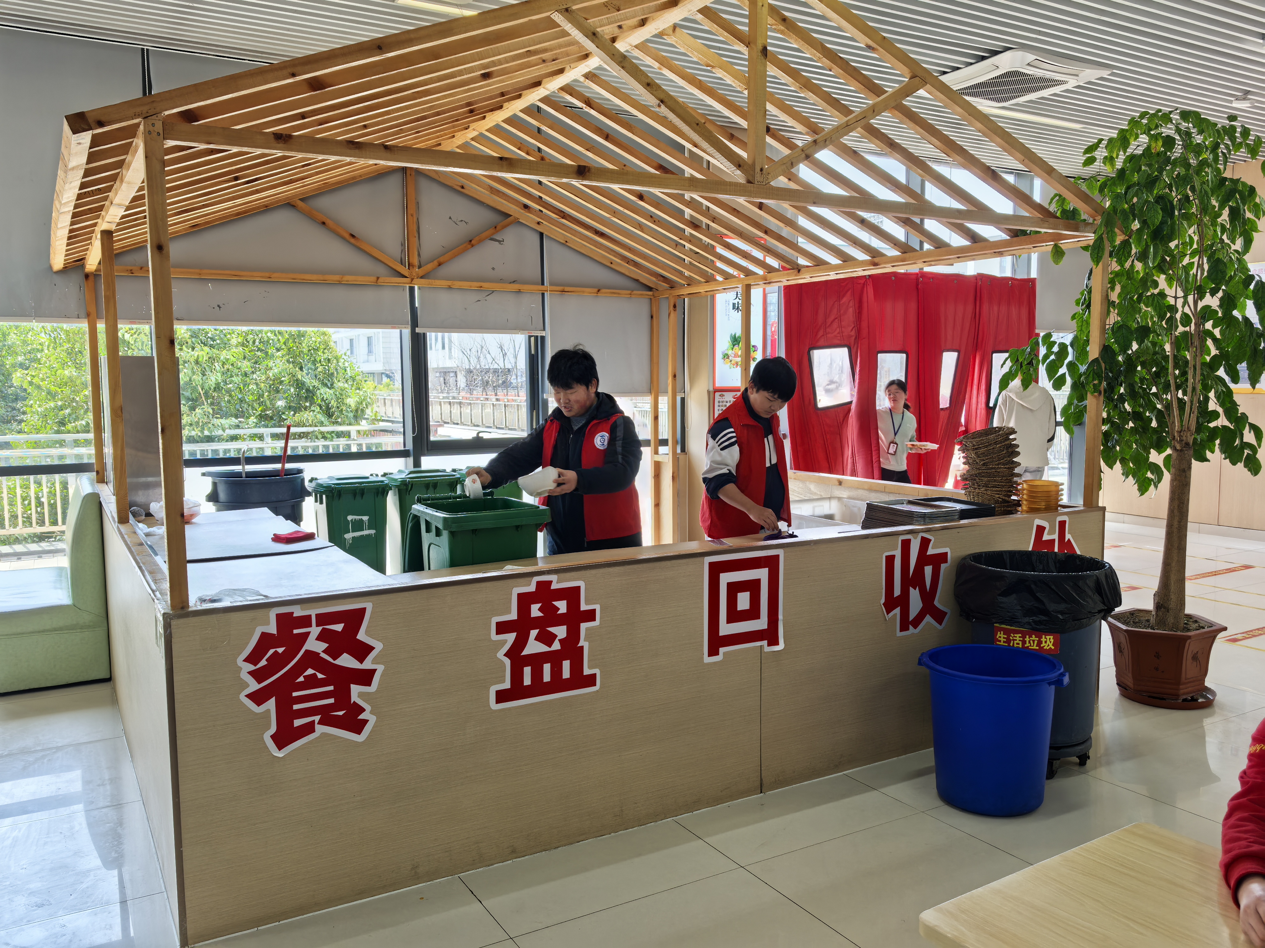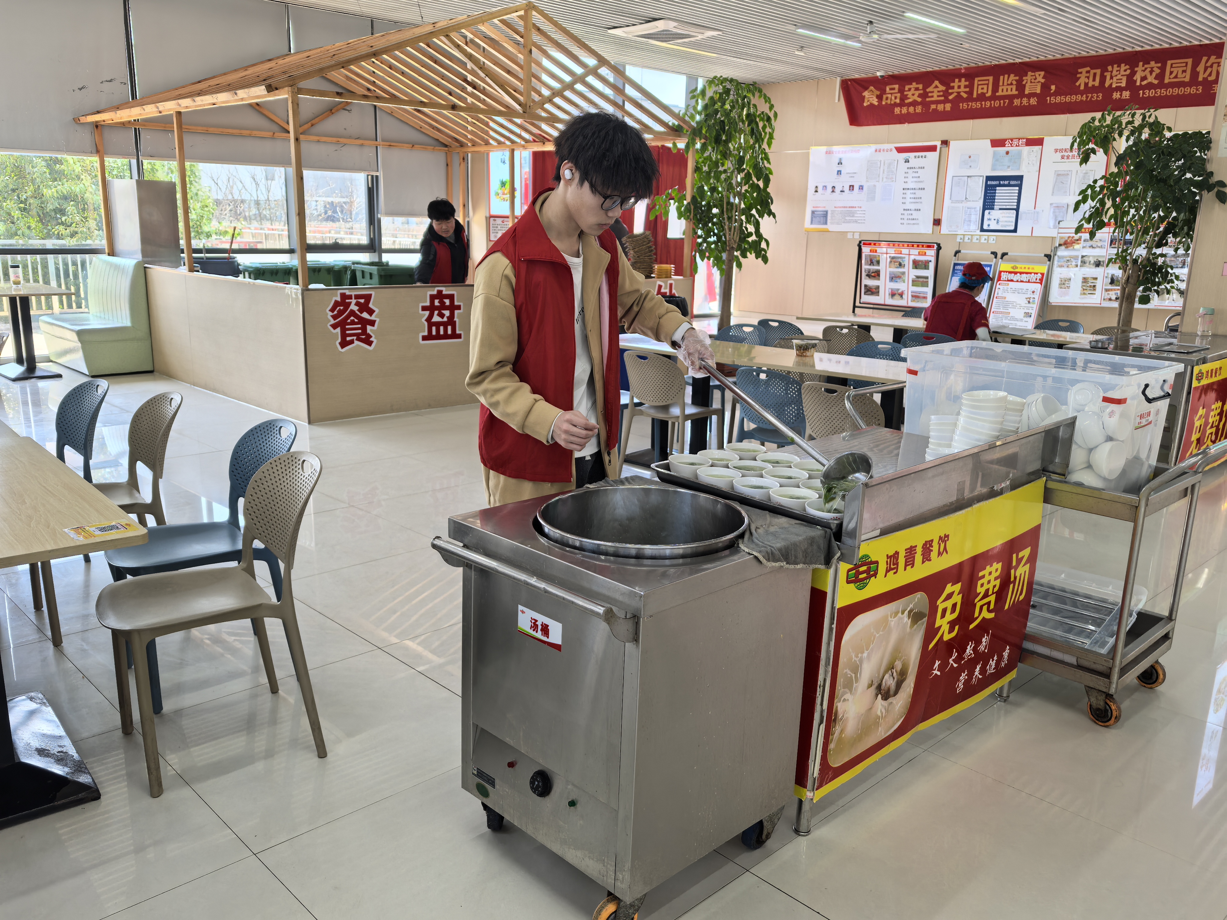 活动开始,sunbet申搏团总支对志愿者进行了分组培训与任务分工,明确各小组职责,分为“食堂服务组”“车辆整理组”“生活帮扶组”三支队伍,分头行动。食堂服务组的志愿者们在食堂一、二楼忙碌有序。他们协助工作人员清理餐桌、擦拭地面,针对餐后残留食物和餐具及时回收整理,确保就餐环境干净卫生。此外,他们在免费汤品区为同学们提供暖心服务。