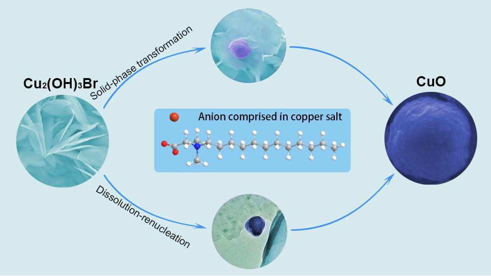 sunbet申搏博士后研究中心是由公司微尺寸储能材料实验室与江苏省华威世纪电子集团有限公司博士后工作站合作建成的以研究储能材料相关理论及开发储能材料相关产品为目的的新型校企合作研发中心。在该中心最新相关工作中,以崔霞老师牵头的小组,打破了液相合成氧化铜的过程是由氢氧化铜单一消溶再成核的过程这一传统理念,巧妙利用该组自合成的长链季铵类羧酸盐,减缓了氢氧化铜向氧化铜转变的速度,使得反应能够可控分步进行。将分步产物借助高倍扫描、透射电镜等,清晰捕捉到氢氧化铜向氧化铜转变的不同过程,即:纳米氧化铜在液相反应过程中存在着固相转变与消溶再成核并存的现象。通过数据分析证明前人因无法减缓反应速度而忽略了固相转变的过程,借住小组自合成盐将为液相下氧化物转变理论的多元性提供重要证据。该项成果得到美国化学协会相关审稿专家认可,得以发表于该协会晶体类顶级期刊。这是该团队继发现氢氧化锌转变为氧化锌过程中存在这一特殊现象的基础上,再次在氧化铜类材料上得到了相同的验证。下一步,该团队还将继续利用自合成相关盐类扩展研究范围,为液相下制备不同储能类纳米材料的合成理论作出更多贡献。