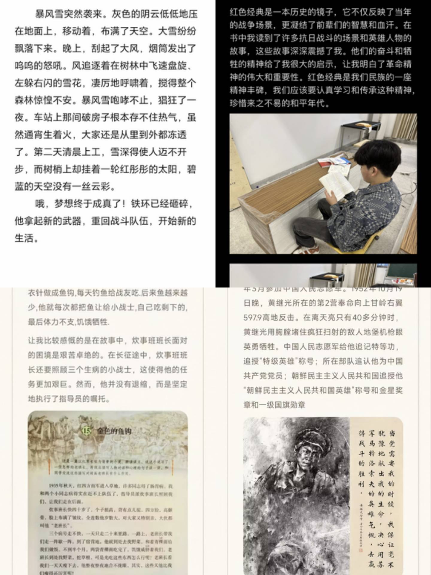 活动过程中,同学们热情高涨,纷纷投入到红色书籍的海洋中。他们利用课余时间认真阅读,互相交流心得体会,深入探讨五四精神的内涵和时代价值。其中《重返五四现场》《触摸历史与进入五四》《共鉴五四》《自由神话的终结》和《红星照耀中国》等书籍成为了同学们的热门选择。23机电3班曾鑫同学表示:“这次阅读打卡活动让我更深切地体会到革命精神的内涵,书中一个个鲜活的革命英雄和革命故事不断激励我努力拼搏、奋勇向前。”